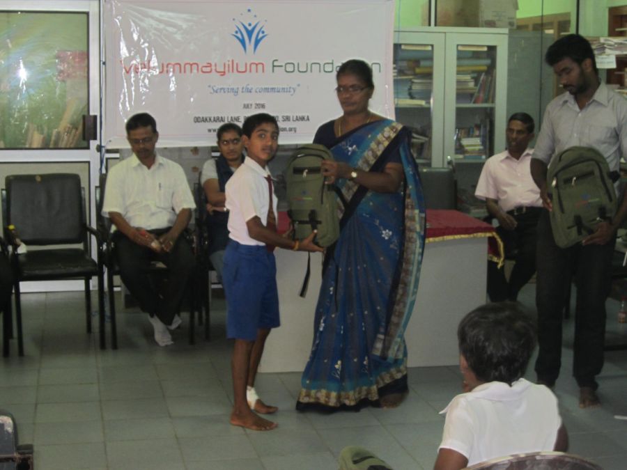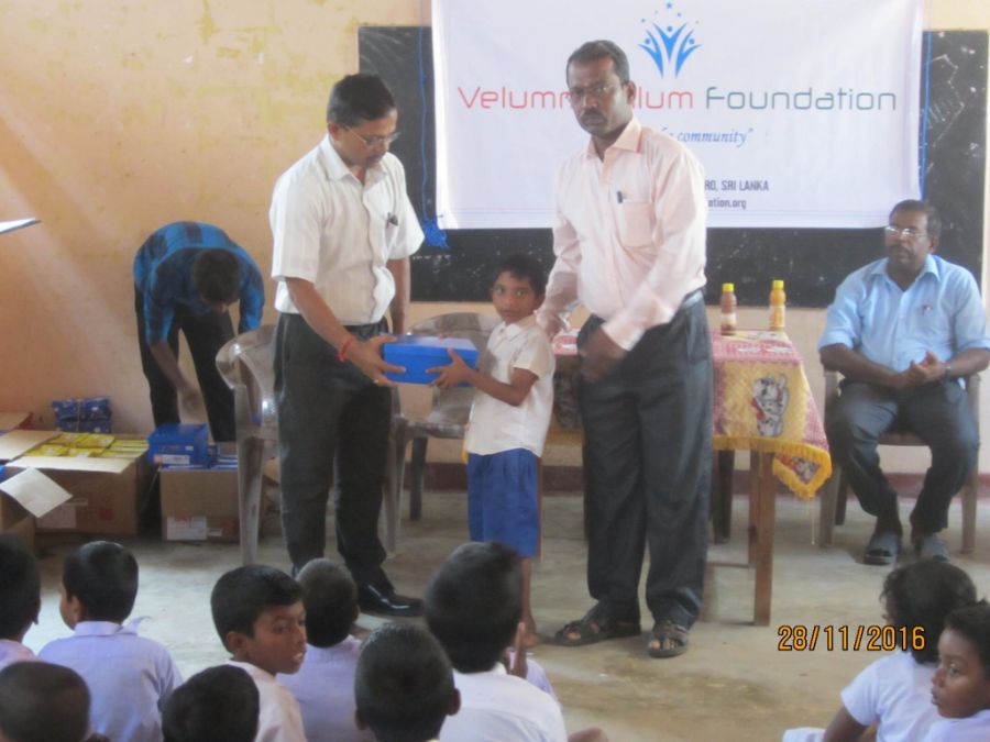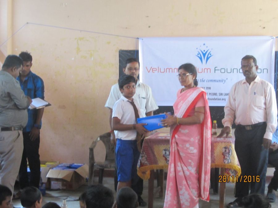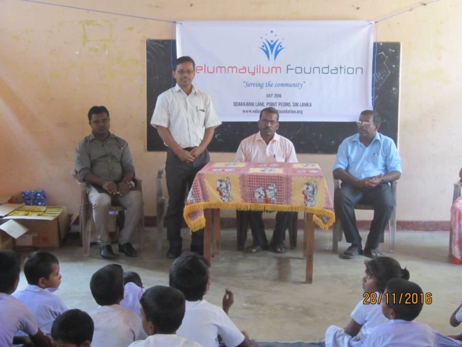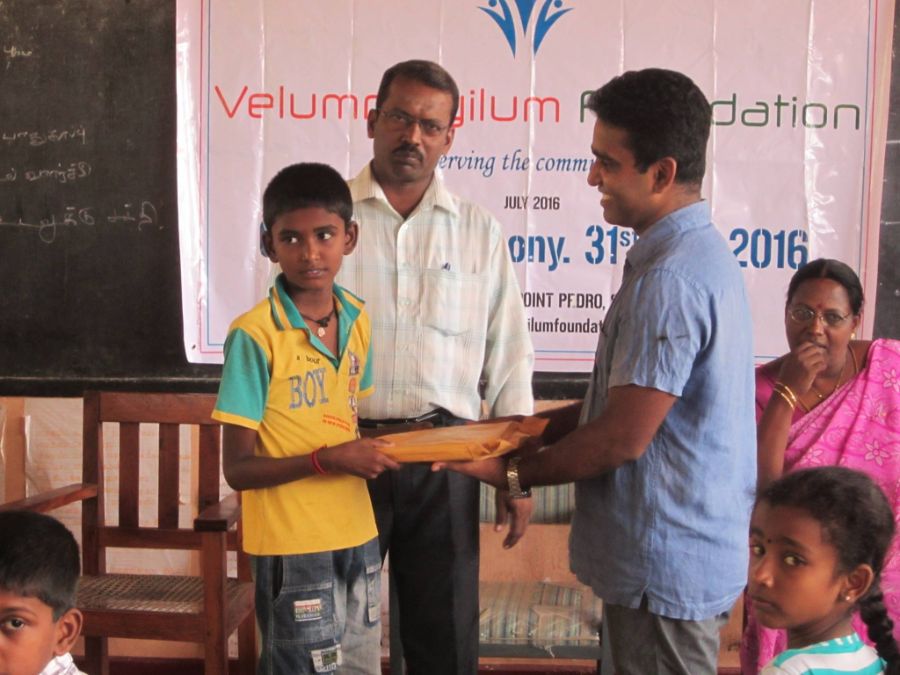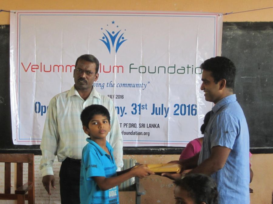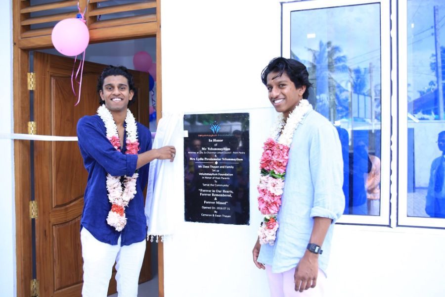 Inauguration of the Velummayilum Foundation with the vision "Serving the community" by Mr. Velummayilum Thayanantharajah and the family in remembrance of his late father "Mr. Velummayilum" an attorney-at-law and former Chairman of the Point Pedro Urban Council. The foundation premises was opened by Mr. Thayanantharajah, Mrs. Sumi Thayanantharajah and Cameron & Ewan Thayan sons of Mr. Thayan on 31st July 2016 along with a program to support underprivileged school children facilitating school supplies such as school bags and stationary.