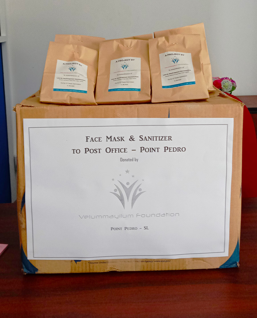 Velummayilum Foundation donated surgical face masks & hand sanitizers to the staff of Point Pedro postal office, enabling them to carry out their regular & important services